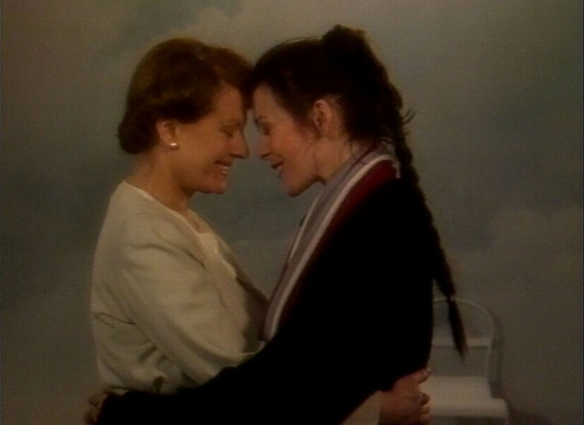 (Delphine et Coralie Seyrig dans Letters home, téléfilm de Chantal Akerman diffusé en 1986, captant la pièce du même nom, écrite par Rose Leiman Goldemberg et mise en scène par Chantal Merle, pièce créée en 1984 au Théâtre Moderne, à Paris.)
