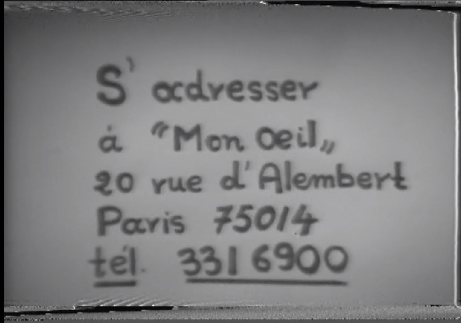À la fin, une adresse est donnée pour recevoir une copie du film. Elle reste suffisamment longtemps pour pouvoir la copier. Je vérifie : l’association Mon oeil ("objet : favoriser l’intégration de la vidéo et d’autres techniques audiovisuelles aux diverses activités sociales et développer l’amitié entre ses membres") existe toujours, et elle n’a pas changé d’adresse. À ce stade (en cherchant sur internet), je ne trouve pas d’autre information. Il faudra sans doute aller voir — et ce sera donc la première mission parisienne pour le livre à venir.