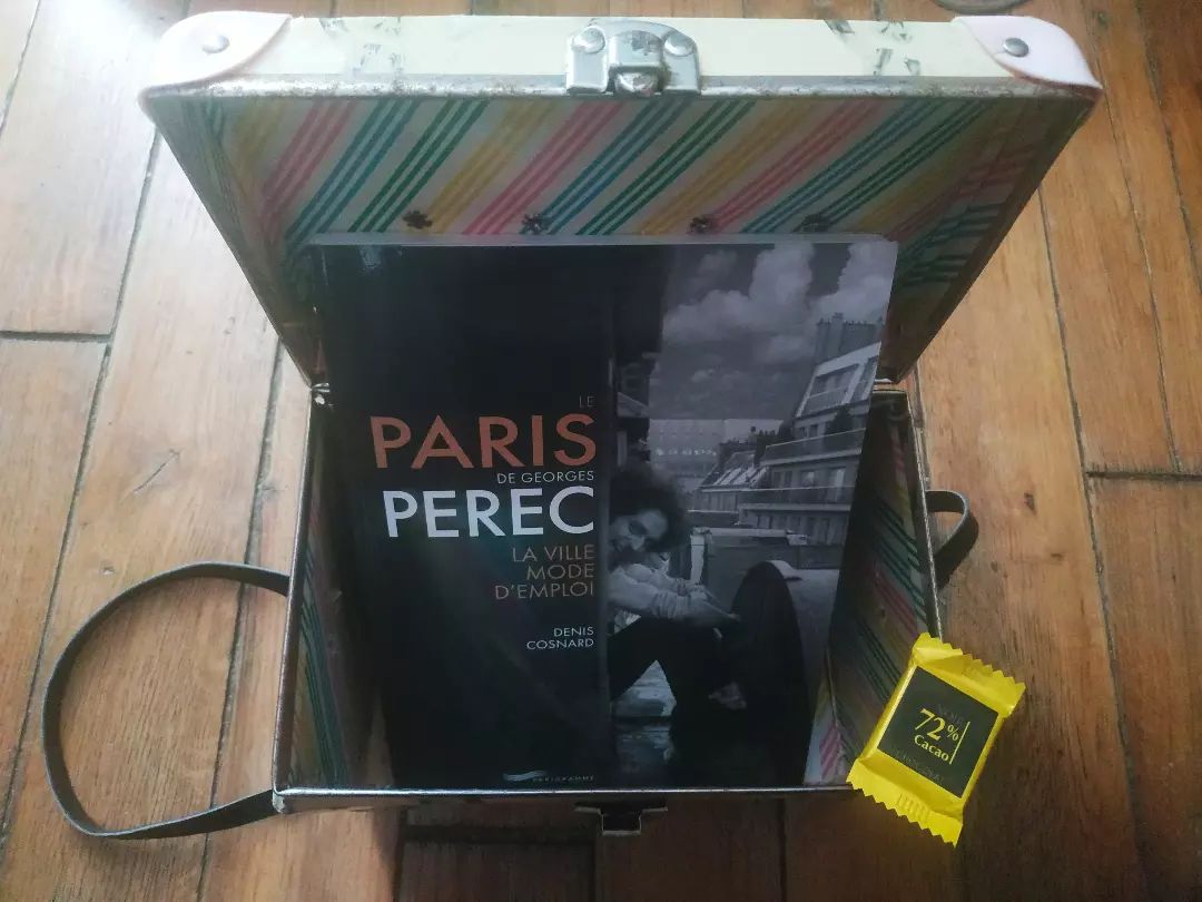 (MM box, tel est le petit nom de cette boîte 80’s offerte par Claro. J’y mets les cadeaux qui me viennent en droite ligne de la publication de Musée Marilyn. Cette fois, le Paris de Perec donné par Juliette, des Buveurs d’encre, après la soirée qu’on peut désormais écouter en ligne, et un petit chocolat offert par la RTS lors de mon passage dans l’émission Vertigo)