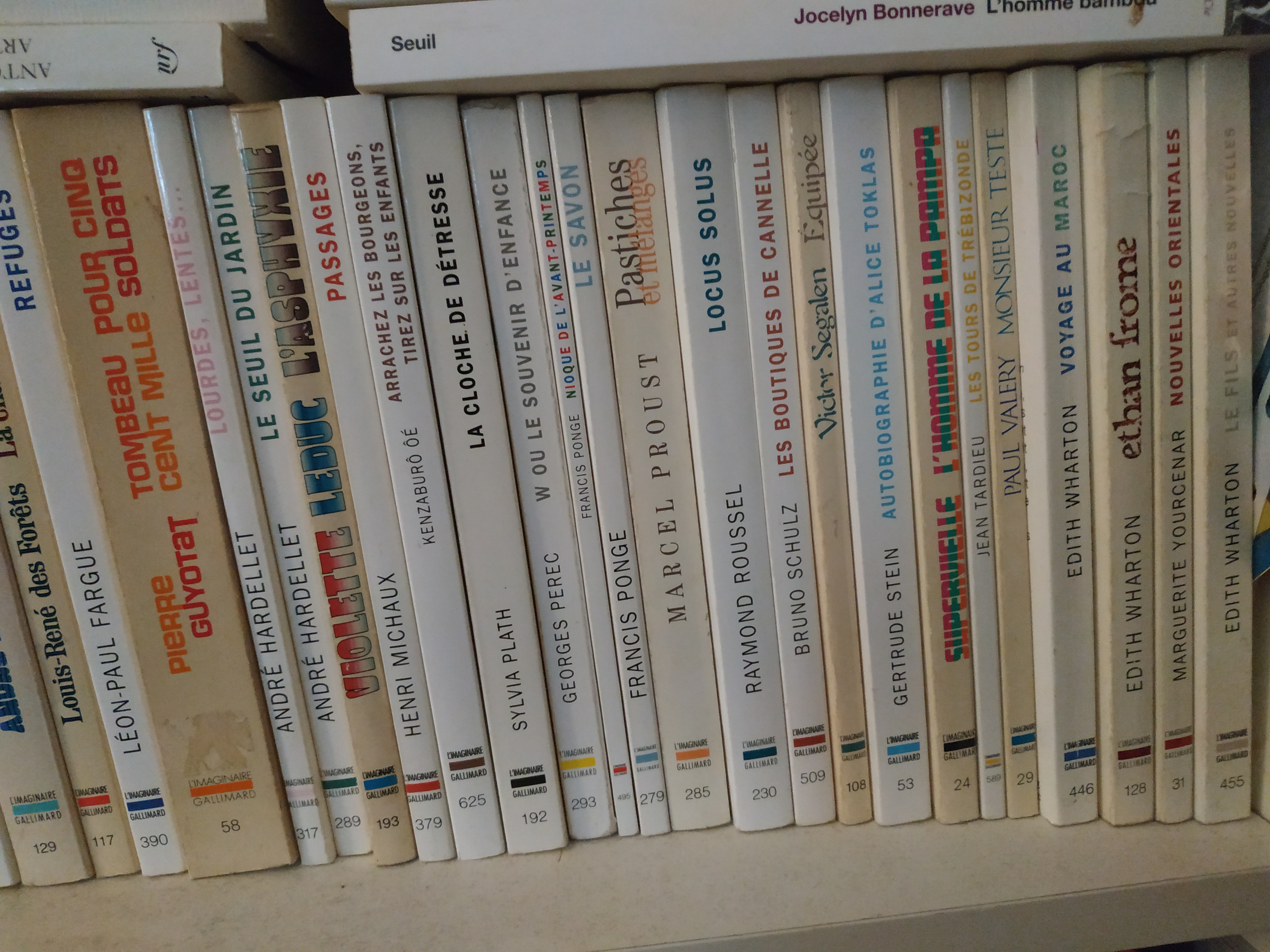 Puisqu’on parle d’objets, pourquoi est-ce que je montre cette série de livres de L’Imaginaire depuis tout à l’heure ? Précisément parce que je collectionne les éditions d’occasion, manie qui me vient d’un immense agacement face à ce que Gallimard en a fait depuis quelques années : les nouveaux ouvrages sont de si mauvaise qualité (ah, les couvertures !!) qu’on a l’impression qu’ils sont sales alors qu’ils sont encore neufs. Du coup, je rachète chez les bouquinistes les exemplaires des années 70-80 que je trouve, ce qui me permet au passage de découvrir des textes vers lesquels je ne serais peut-être pas allée. Avec le code et l’abrutissement post-vaccin, la fréquentation des bouquinistes a été ma troisième activité de la semaine.