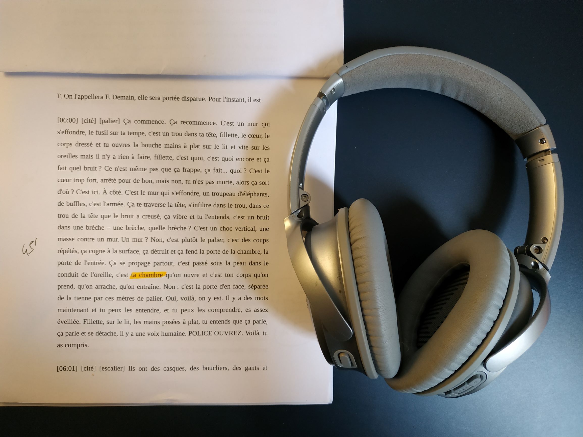 Retour à Marseille cette semaine pour écrire Bruits, que j’ai eu bien du mal à faire progresser entre deux périodes de résidence. Les dernières fois, l’appartement de centre-ville était très silencieux. Cette fois, ce sont des coups de masse que je commence par entendre : le voisin de palier, nouvellement propriétaire, perce, puis abat des cloisons. Les travaux dureront jusqu’à la fin de mai, est-il indiqué dans l’entrée. Avais-je besoin que le réel me donne de la matière ? Réponse indiscutable : non. Je parle un peu avec le proprio démolisseur (très sympa), il me donne son planning (cloisons abattues, gravas à enlever). Le lendemain, je constate qu’il prend du retard, me repère à l’oreille, cherche à me rassurer avant de sortir mon casque.