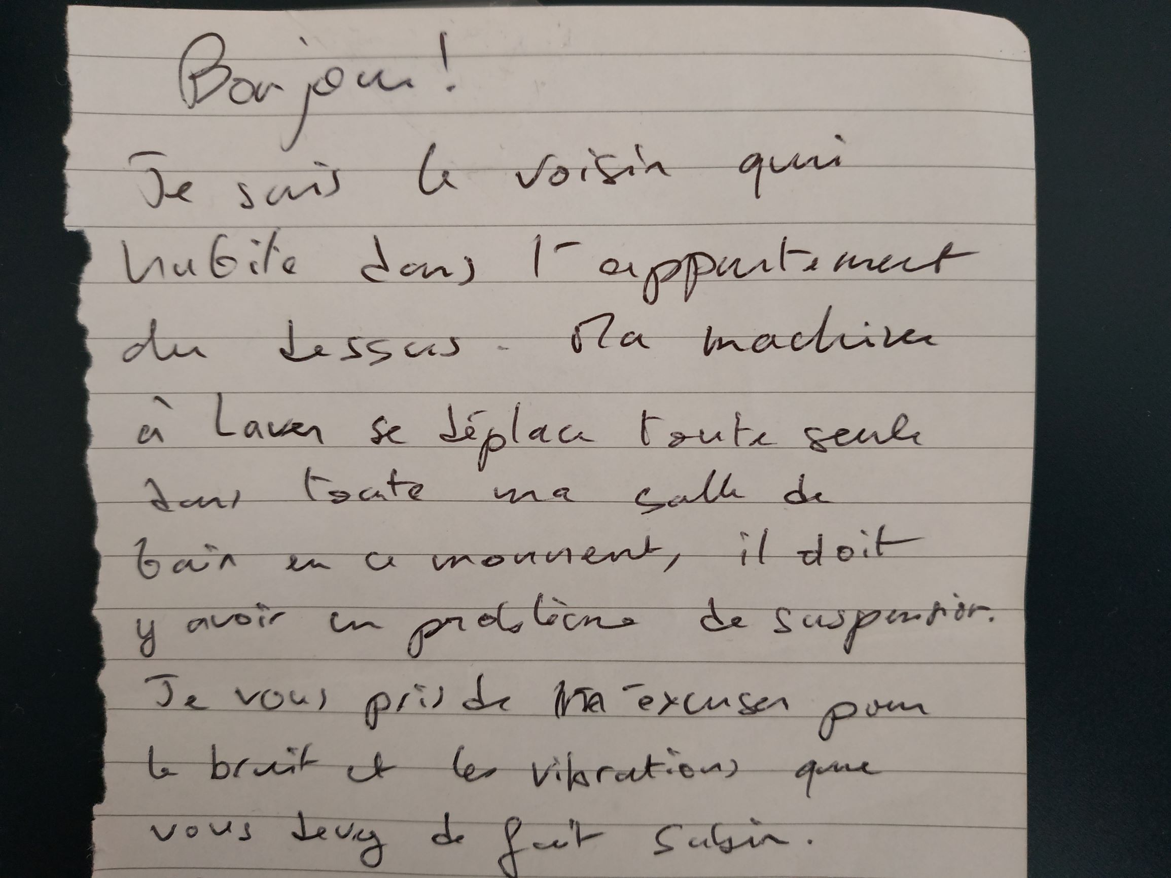 Autre étonnement, alors que je m’y mets, en tournant la tête : sous l’imprimante, je trouve le petit mot d’un second voisin, celui du dessus, dont la machine à laver a pris son indépendance. Destiné à la résidente d’avant, je pense (moi, jusqu’ici je n’ai rien entendu), il est charmant et franchement comique : chercher le silence pour écrire Bruits, quelle idée !
