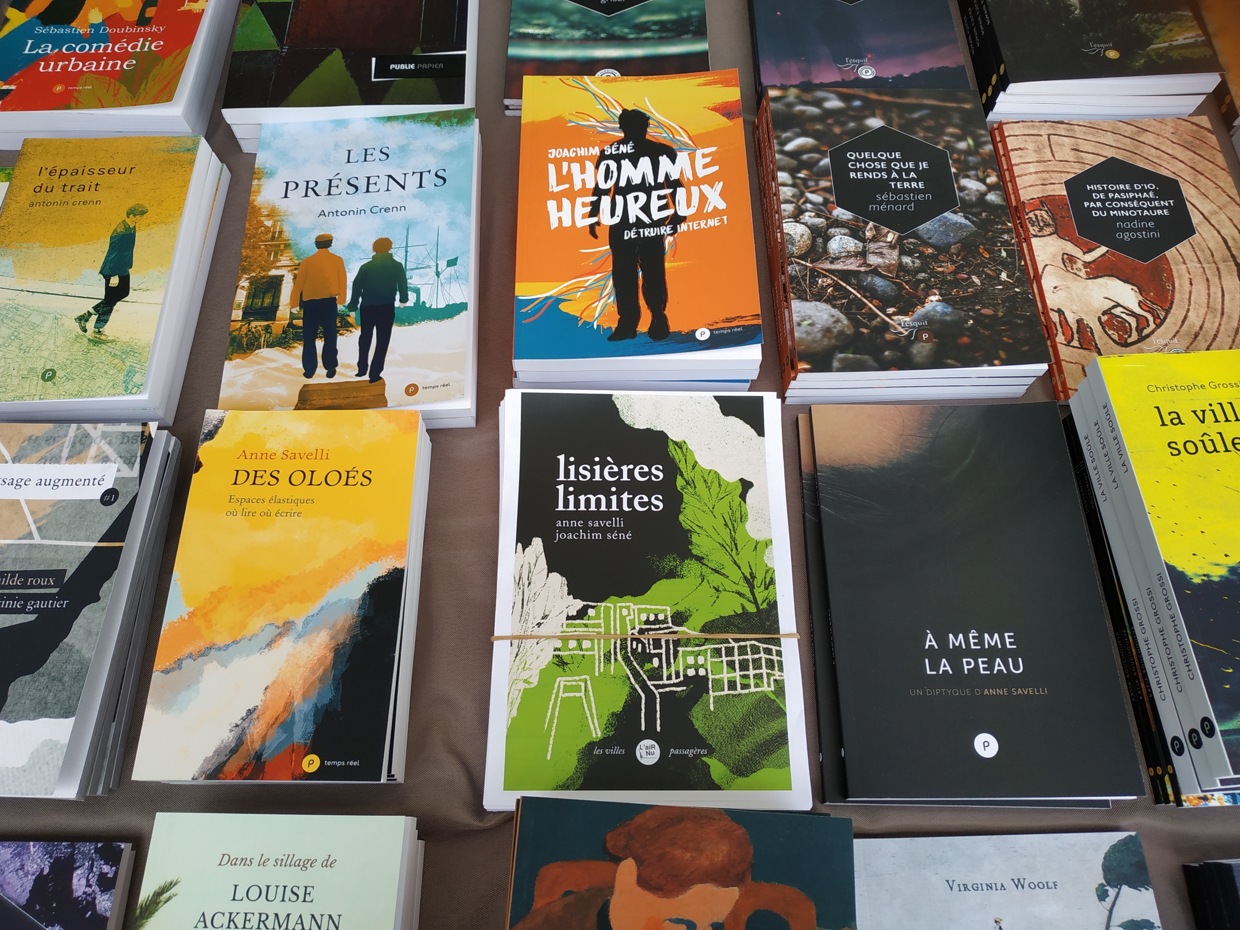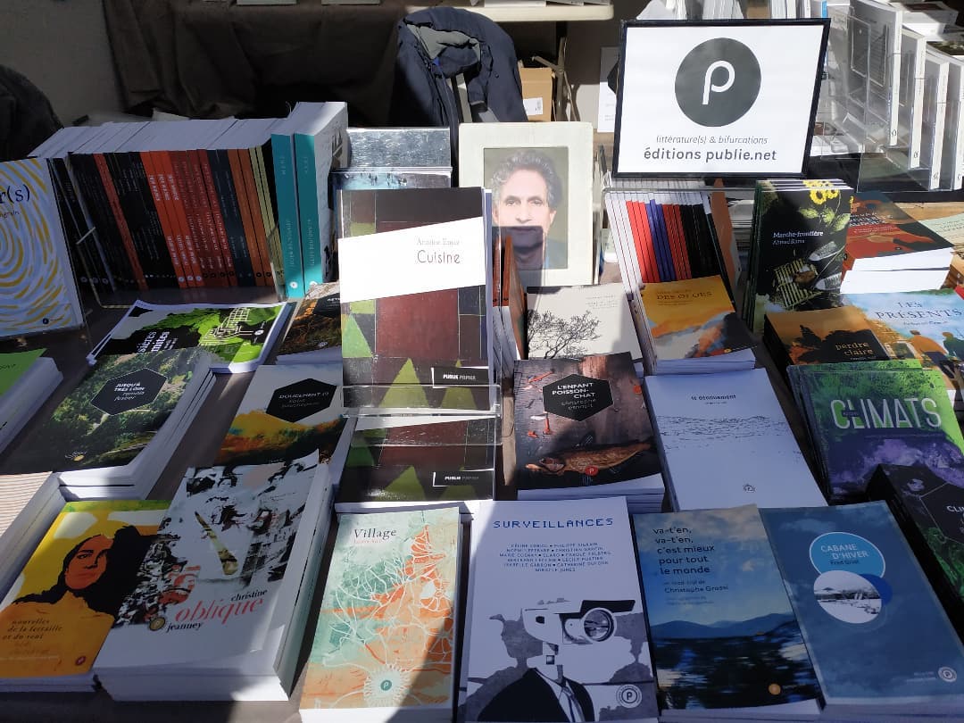 Roxane qui, toujours elle, a crée les couvertures de nos livres chez publie.net mais aussi de ceux de L’aiR Nu (dont Lisières limites). Nous arrivons mercredi, premier jour du marché, munis des flyers que Joachim a conçus et que l’université Gustave Eiffel nous a généreusement offerts. Guillaume Vissac en place quelques uns sur le stand de publie (voir photo ci-dessus). Ester Modié propose, elle aussi, d’en poser quelques uns chez les Inaperçus, autre maison d’édition que j’aime retrouver au Marché (j’ai d’ailleurs craqué pour leur dernier livre).