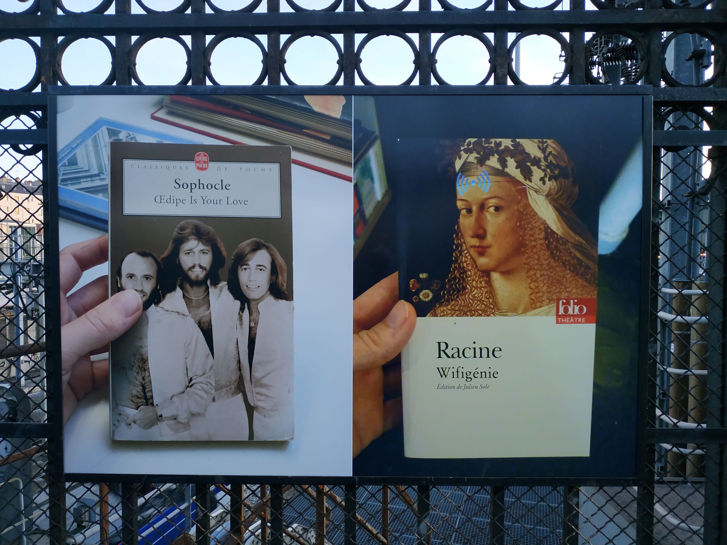 (heureusement, disco for ever : détournements de Clémentine Mélois exposés au-dessus des voies de la gare du Nord, photographiés en revenant de l’atelier dont il est question ci-dessous)