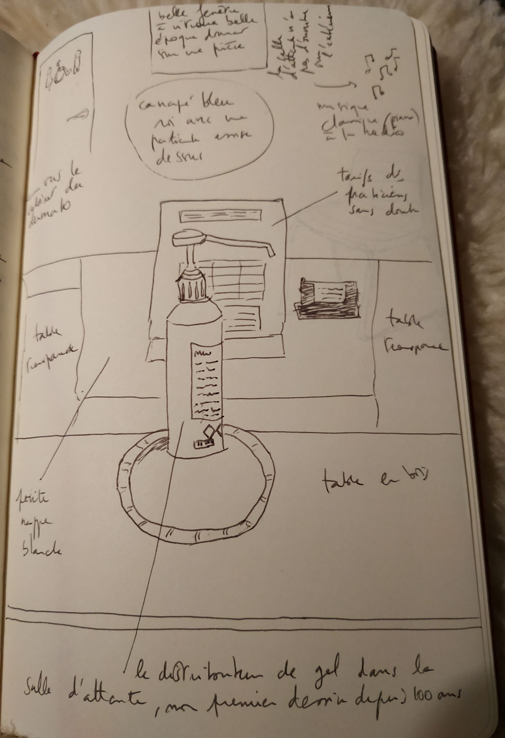 N’empêche : sans la première proposition, celle du dessin, est-ce que j’aurais réussi à calmer les effets du stress dans la salle d’attente tout à l’heure, alors que je devais patienter avant de voir un spécialiste pour un rendez-vous (un peu) redouté ? Lire, dans ce cas, ne fonctionne pas, le scroll sur le téléphone moins encore. Dessiner très mal, avec la sensation de n’avoir pas refait ce geste depuis le lycée, fut une façon de dompter sans enjeu ce que les nerfs tricotaient de leur côté (qu’est-ce qu’il va me dire ? Est-ce que tout va bien ?). Premier objet : un distributeur de gel devant moi devenu plat comme une limande, raide sur son plateau. Plaisir de se dire qu’on peut gommer, recommencer, que la marge est immense jusqu’à la satisfaction. Plaisir, oui, parce qu’il n’y a pas de demande, rien à prouver : une légèreté.