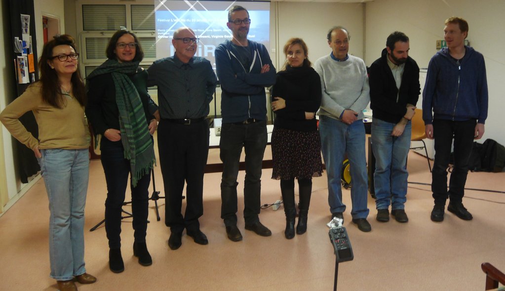 (de gauche à droite, concentration d’auteurs lecteurs devant un même enregistreur : Mathilde Roux, Virginie Gautier, Lucien Suel, Olivier Hodasava, Anne Savelli, Piero Cohen Hadria, Benoît Vincent, Joachim Séné)