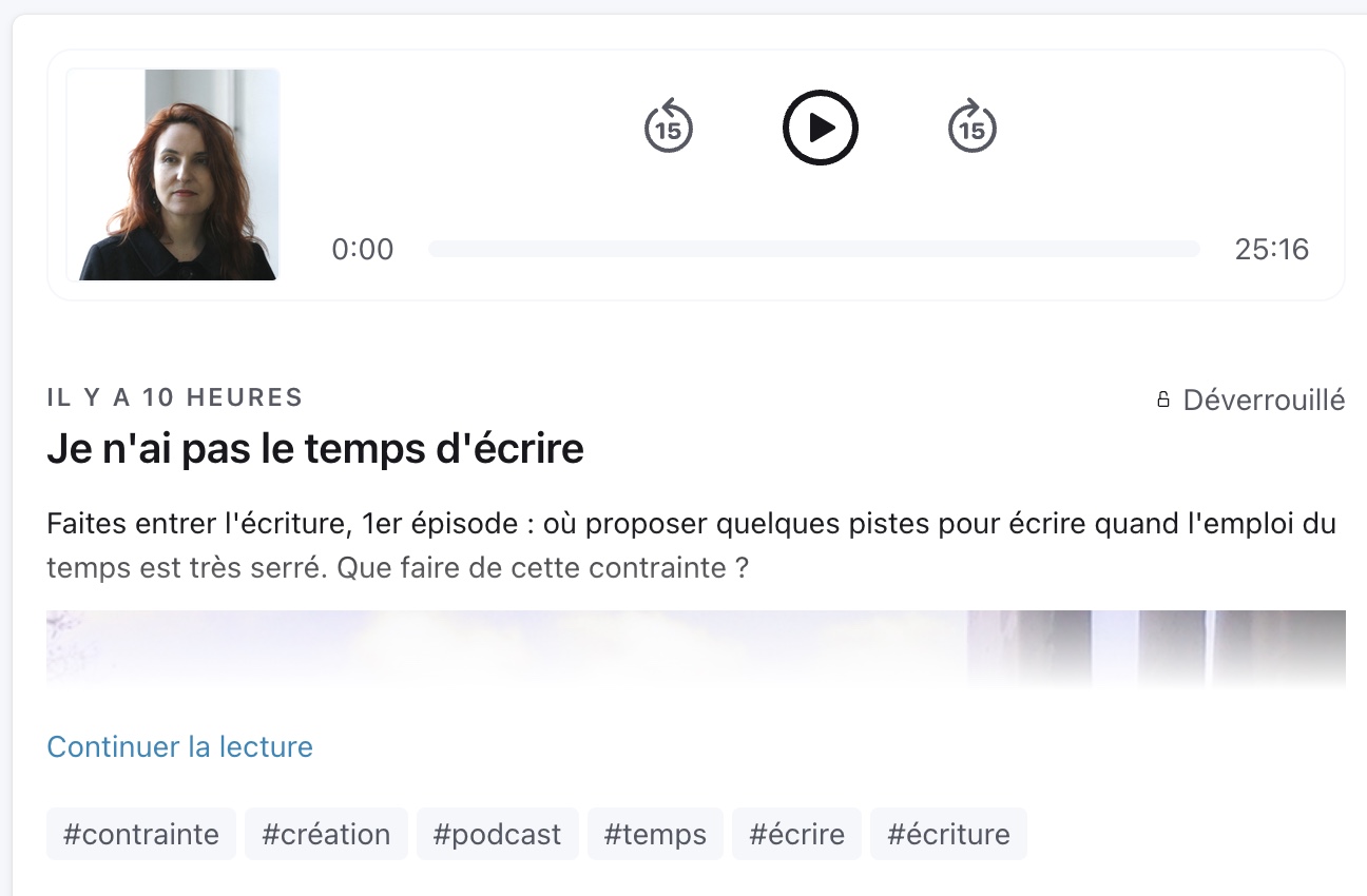 En ce qui me concerne, j’actualise chaque dimanche, pour tous les abonnés, la page que j’y ai créée en proposant un espace de discussion. Une fois par mois, j’y mets également en ligne, pour les contributeurs des niveaux 2 et 3, un podcast intitulé Faites entrer l’écriture.