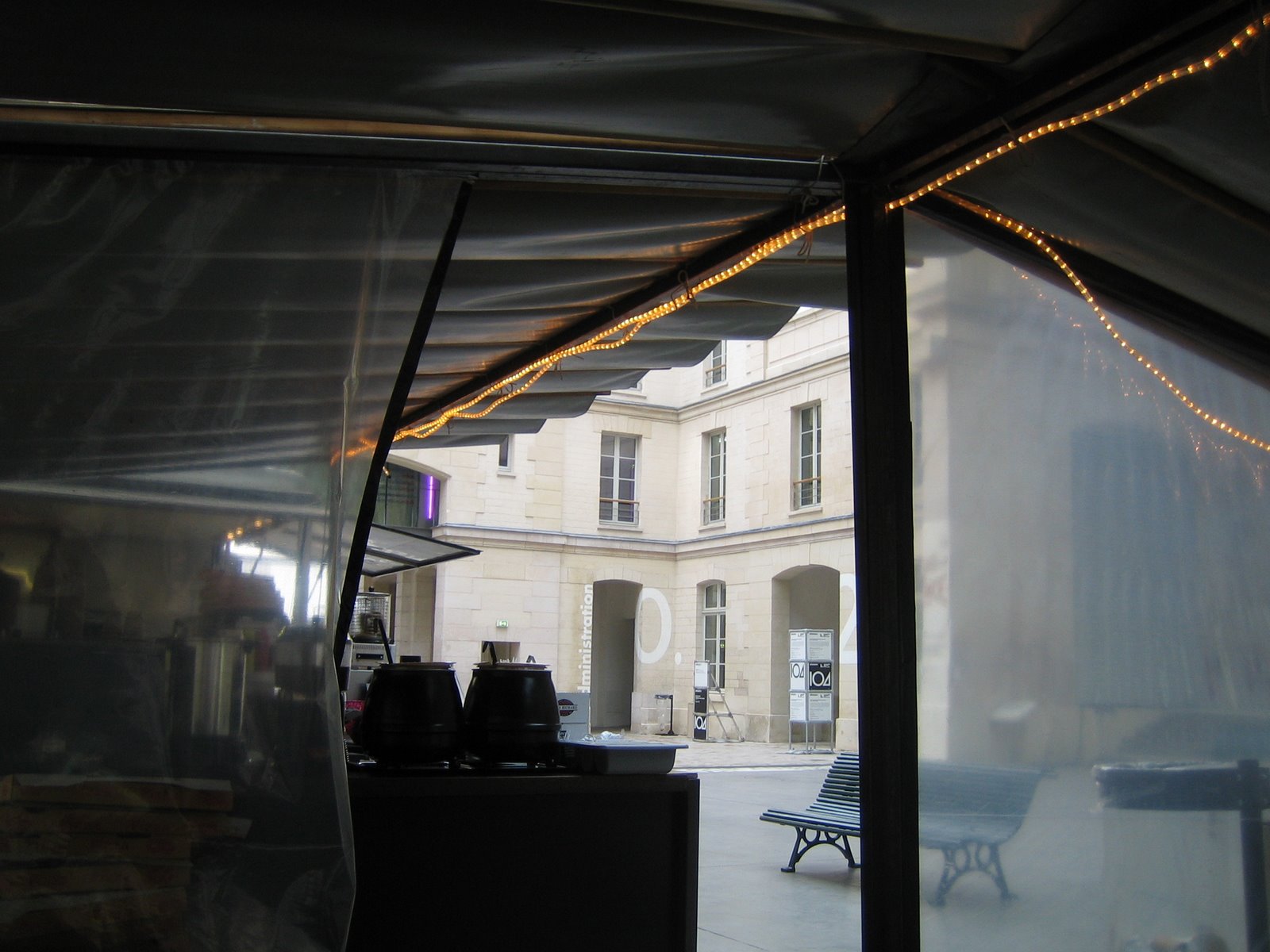A l’intérieur, quatre longues tables, huit bancs, souffle remué du chauffage qui ne chauffe rien – mais sans ce bruit ce serait trop d’hiver. Délimite les quatre murs, le toit, harmonise l’ensemble : une guirlande électrique de type chic, monochrome, suite de diodes adoucies par la gaine protectrice qui donne un air de fête, bien sûr, mais une fête qui ne demande rien. Dans son sillage pas de nécessité d’alcool, musique forte, flonflons. On peut rester à ne rien faire.