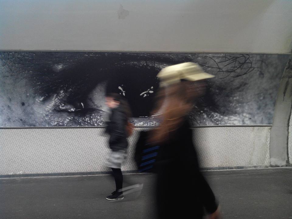 Couloir de la Chapelle. JR te regarde, mais tu ne le vois pas. JR ne te voit pas mais il veut que tu regardes. Quelqu’un regarde JR, on ne sait pas qui c’est. Tu regardes devant toi, JR est un décor, JR ne veut rien dire. JR n’a rien à dire, rien d’autre que : regarde, pour cela te fait croire qu’il te voit dans les yeux.