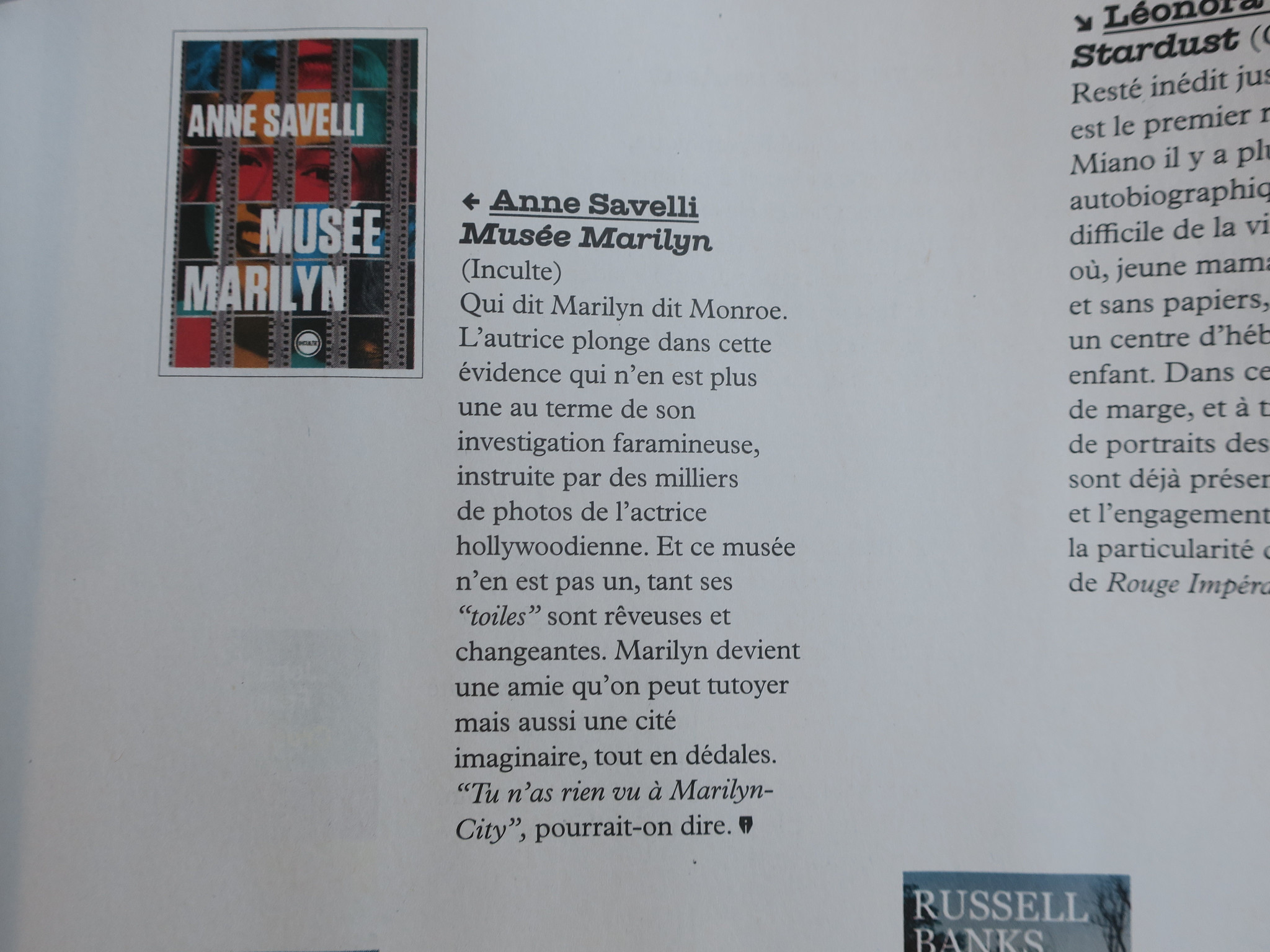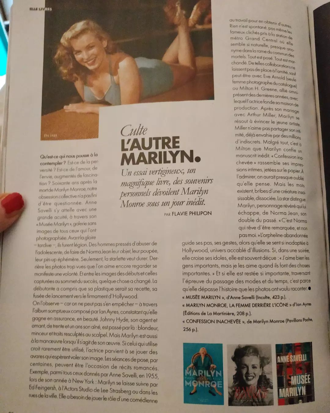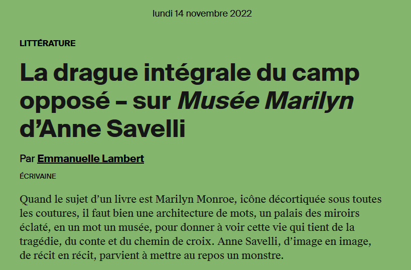 Musée Marilyn – fruit de sept ans de recherche et d’écriture – propose une approche totalement inédite de l’actrice américaine la plus iconique du XXᵉ siècle. S’appuyant sur une documentation vertigineuse, Anne Savelli a structuré son livre comme un musée – un musée vivant, sensible. Elle nous raconte un être de chair et de sang et non un fantasme de papier glacé. Au fil des rencontres avec ceux et celles qui l’ont « prise » en photo (André de Dienes, Eve Arnold, Milton H. Greene, Cecil Beaton, Richard Avedon…), une vérité humaine se fait jour avant de disparaître dans la nuit.