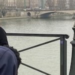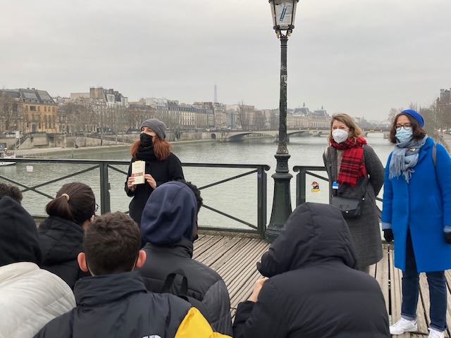 (rare image de l’autrice sur le point de déclamer Le Pont Mirabeau sur le pont des Arts, soutenue dans cet effort par la conférencière, Virginie Fromentin, et l’enseignante, Charlotte Lafon, photo de Sarah Akacha)