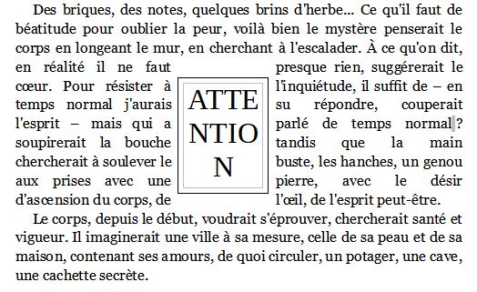 Déjà, j’avais demandé à Joachim s’il pouvait animer, en les codant, certains signes, certains mots. Cependant, pas plus un ePub qu’un livre imprimé ne pouvaient aller dans mon sens, permettre ce que j’aurais voulu. Et puis, je me demandais : est-ce que ce désir d’animation ne cachait pas autre chose ? Est-ce que je n’avais envie de faire "remuer" mon texte, que j’avais peur de trouver illisible, afin qu’il puisse l’être vraiment ?