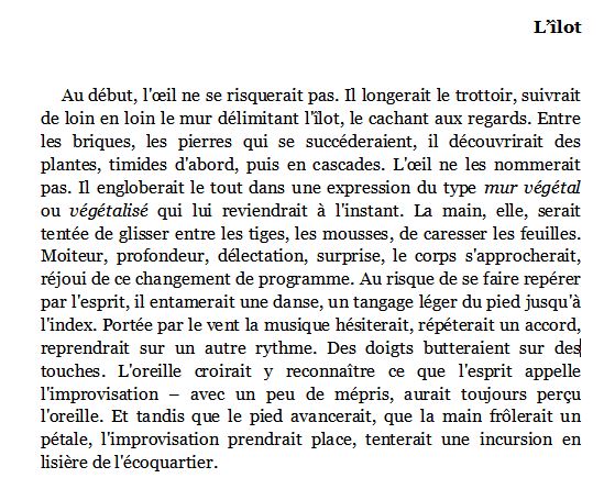 Et tout s’est mis à fonctionner comme je l’espérais depuis le début. En fait, j’avais besoin d’un cadre, mais d’un cadre dedans : j’avais besoin d’encadrer le cadre de ce texte de commande pour me l’approprier. J’ai passé une journée entière à jouer avec ce nouveau jouet (une journée de douze heures, disons). À la fin (il n’y a là aucun jugement de valeur, c’est juste une constatation), mon texte m’est apparu comme je l’avais écrit.