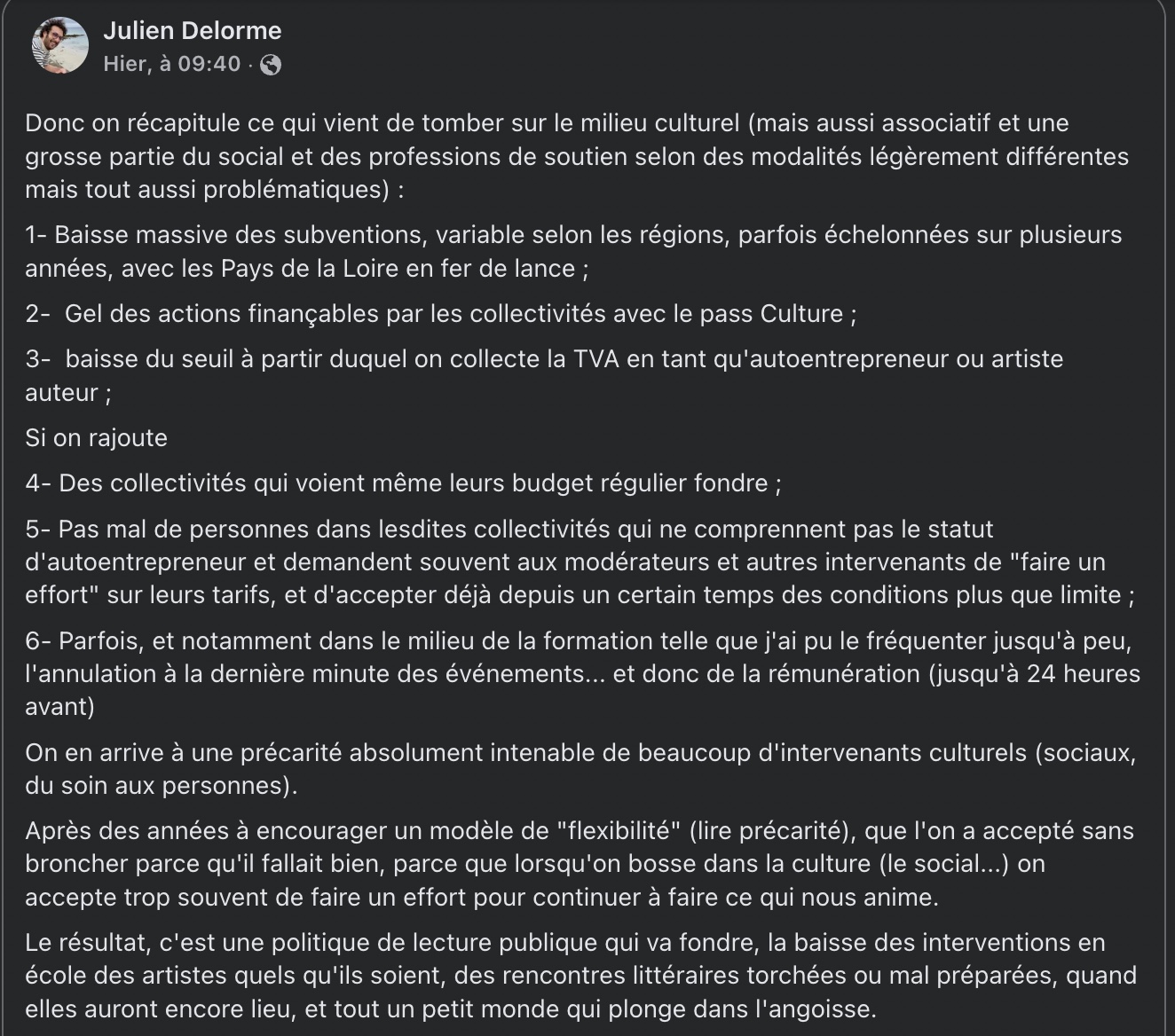 À la radio, quand les journalistes parlent du gel de la part collective du Pass Culture, qui vient mettre à mal de nombreux projets qu’ont monté cette année les artistes en milieu scolaire, leur coupant l’herbe sous le pied, souvent, ils ne citent que les compagnies de théâtre en exemple. Or, pour beaucoup d’auteurs, qui traversent le pays de part en part (je l’ai fait pendant des années, ai décidé d’arrêter de mener cette vie-là en juin dernier, sans du tout être sûre de la suite), ces interventions sont souvent leur principale source de revenus, à eux aussi.