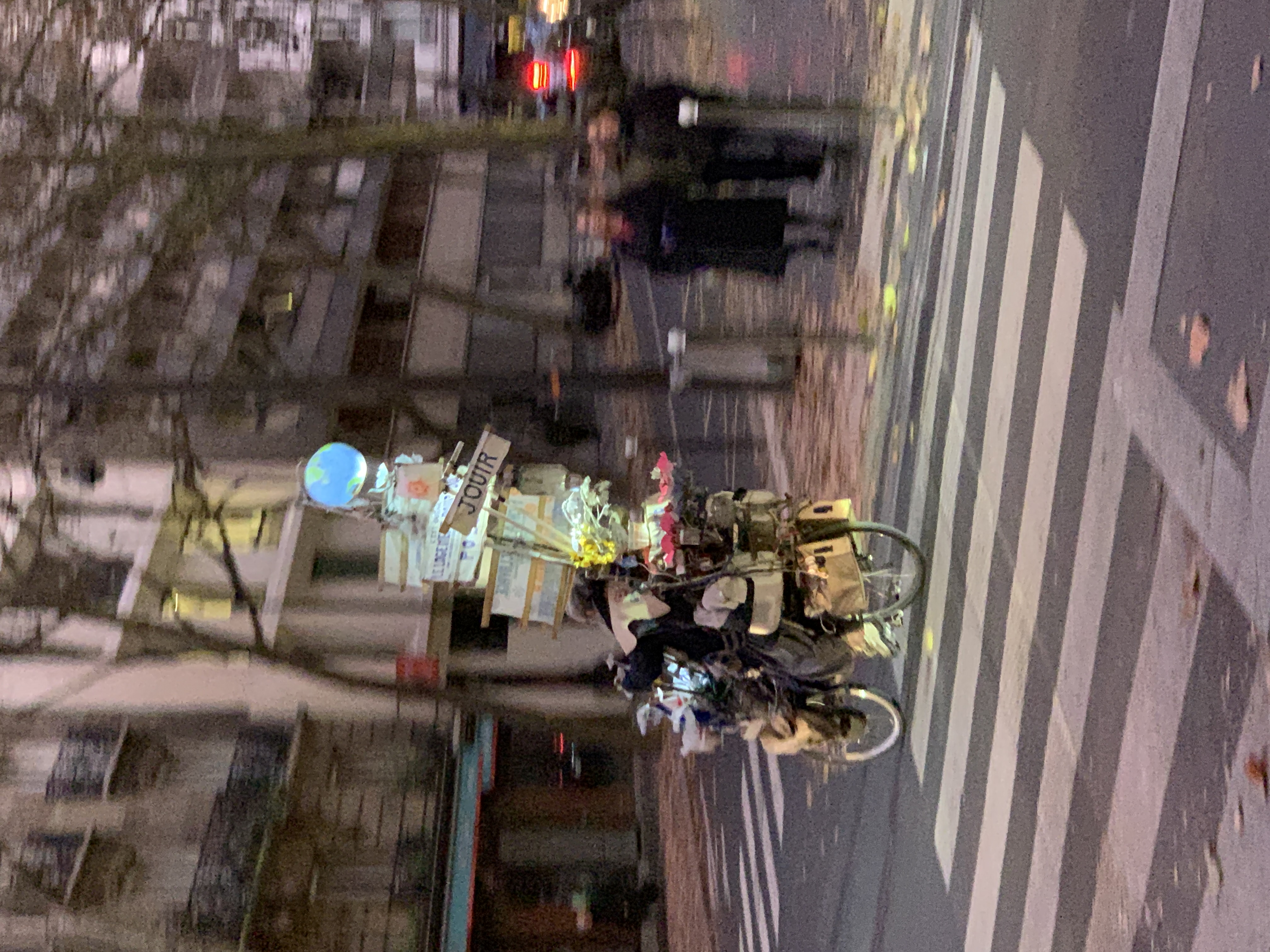 Dimanche Affligée par ce que j’écris (même si le semainier est précisément un journal d’écriture, je ne vais pas m’étendre sur le sujet), je finis par détester la terre entière, pester, m’agacer pour un rien. À la nuit tombée, je décide de sortir, de m’aérer un peu. J’oublie mon téléphone, je remonte, le prends, redescends et là, à cet instant-là, passe devant moi ce Mouna de 2024, avec sa pancarte JOUIR et tout un tas de bricoles que je n’arrive pas à distinguer. La terre n’est plus un monde à honnir mais un globe lumineux flottant au-dessus de la tête. Je souris. Ma mauvaise humeur s’évanouit. Voilà ce qu’il me manquait, précisément : de la fantaisie. La fantaisie est politique. La fantaisie est indispensable, et dans mon livre aussi. Il ne faut pas en avoir peur.