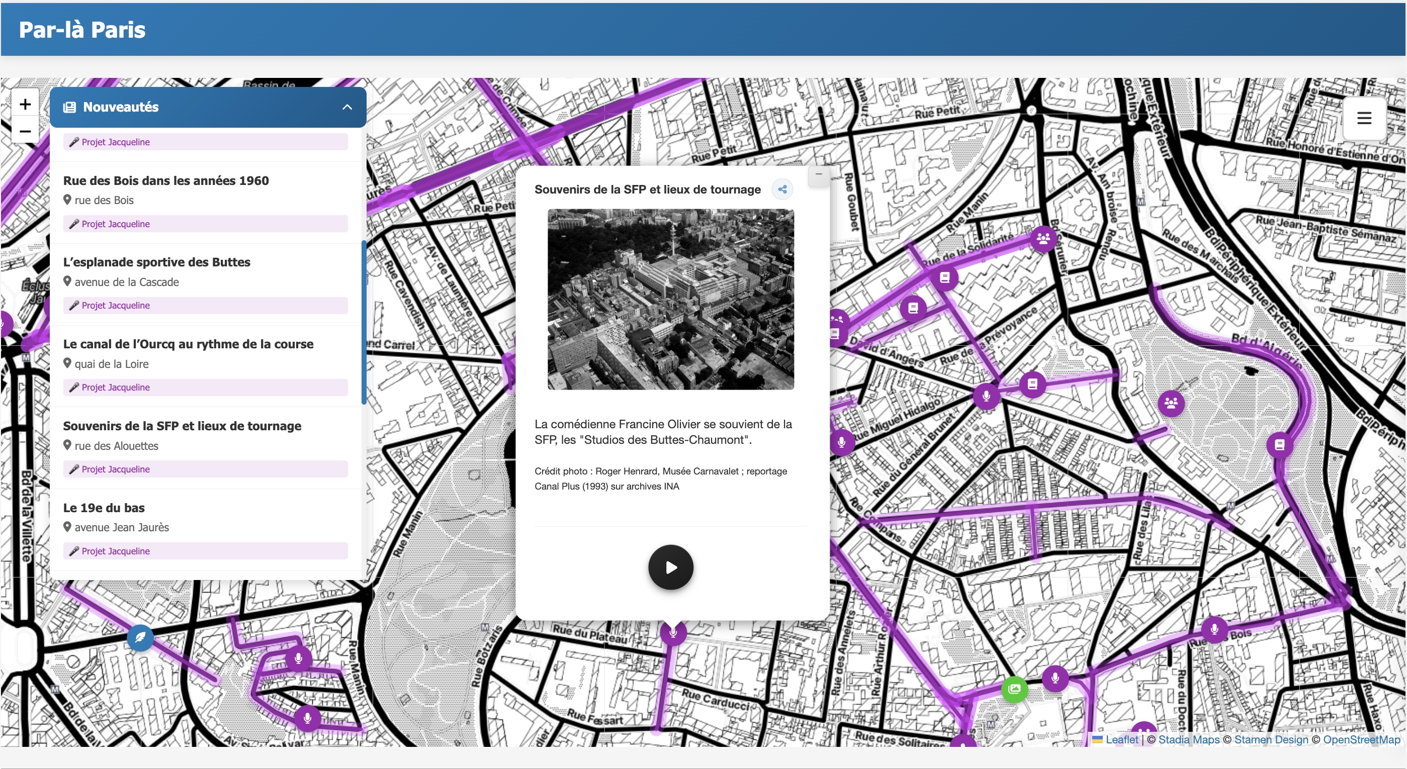 Parmi celles que nous avons rencontrées, par exemple, il y a la comédienne Francine Olivier, bientôt 87 ans, qui nous a raconté la vie de la SFP, studios des Buttes-Chaumont aujourd’hui disparus. Vous pouvez l’écouter ici. (Joachim a rajouté un menu "Nouveautés" très pratique, dans la carte, par ailleurs, vous verrez).