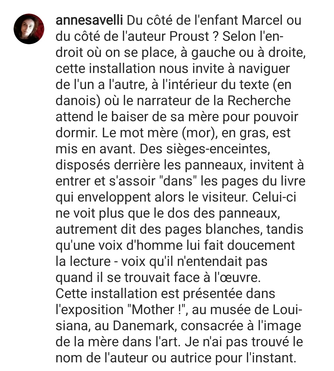 À Louisiana, qui est un lieu hautement aimé de mes amis d’écriture, je m’en rendrais compte plus tard, une des quatre expositions a la mère pour sujet. On y voit cette installation liée à Marcel Proust, dont je note vite quelques éléments :