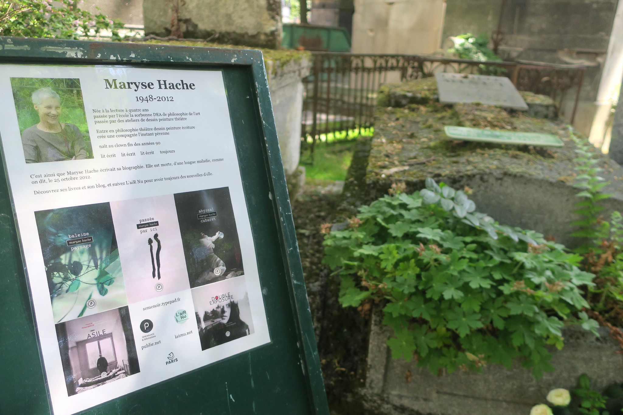 Ce que savaient certains membres du collectif, c’est que la veille, j’avais appris la mort d’un de mes oncles — de celui, plus précisément, dont j’ai été le plus proche dans l’enfance. Réussir à se dissocier de cette pensée pour ne pas se laisser envahir, rester focalisée sur une autre absence, dans un cimetière qui plus est, n’était pas évident. Mais j’ai réussi et j’en suis assez fière, comme de ce panneau renseignant les promeneurs sur l’oeuvre de Maryse, dont nous apprenons le soir qu’il va demeurer en place jusqu’en septembre, ce qui est une joie.