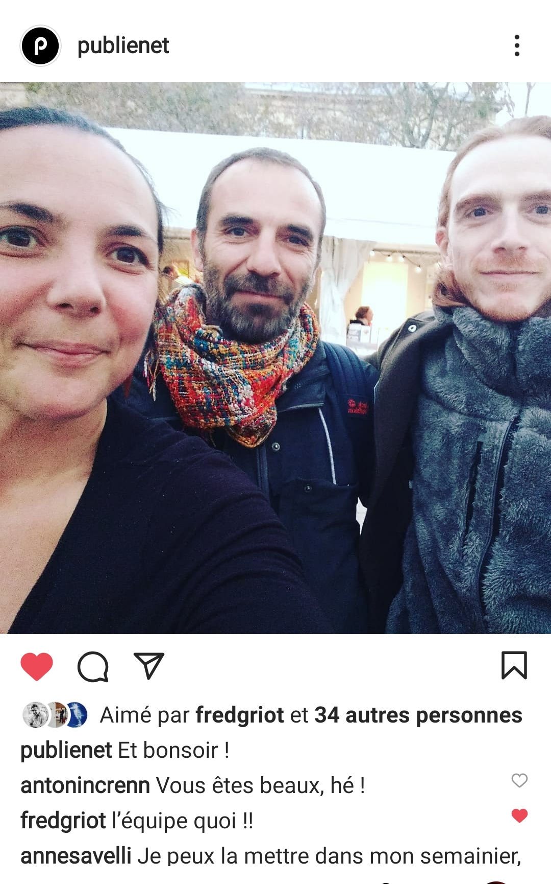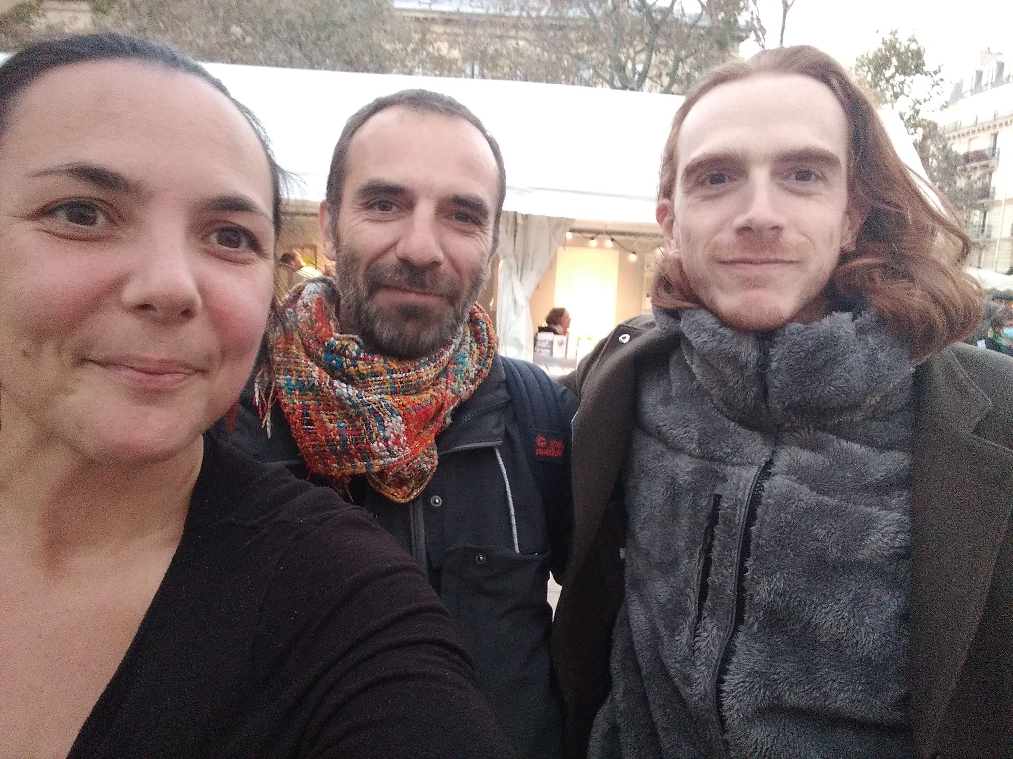 De gauche à droite, Roxane Lecomte, Benoit Vincent et Guillaume Vissac, auxquels ils me faut ajouter ceux que j’ai vus vendredi : Virginie Gautier, Julie la libraire associée à la maison d’édition ou encore Fred Griot, qui sort un nouveau livre. Si le samedi, je ne reviens pas, au moment où j’écris (nous sommes dimanche matin), voir leurs têtes me donne envie d’y retourner.