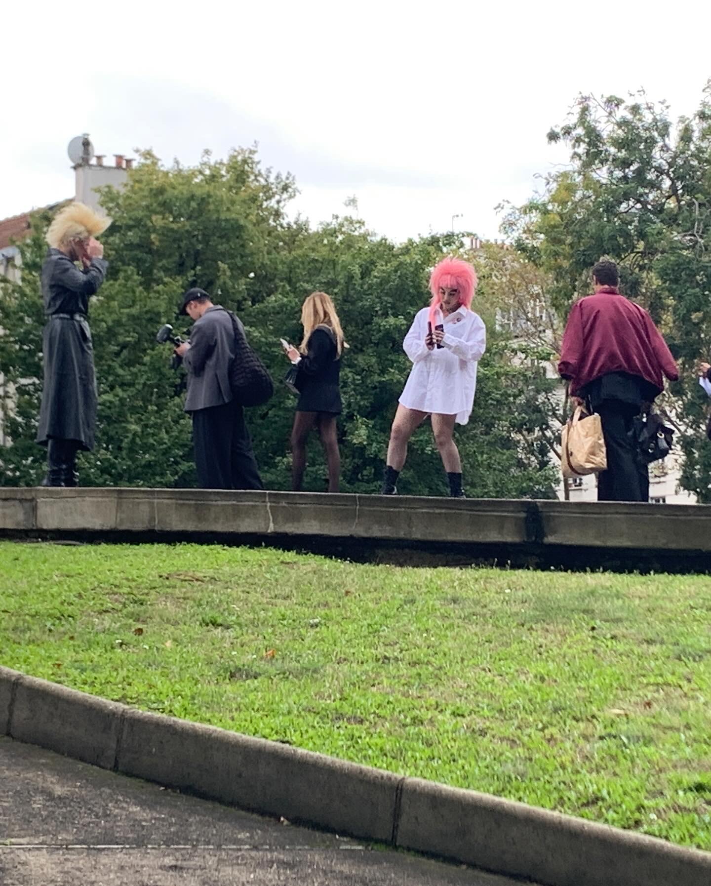 Tout le monde fait la queue pour entrer dans le bâtiment du PC. "Tout le monde", c’est-à-dire, plus exactement, tout un monde très grand, très mince, très jeune, très habillé de noir qui contraste avec nous autres, habitants de Colonel Fabien. La jeune femme revient et, triomphante, passe devant la foule pour poser devant ce que nous appelons, par ici, "la boule blanche".
