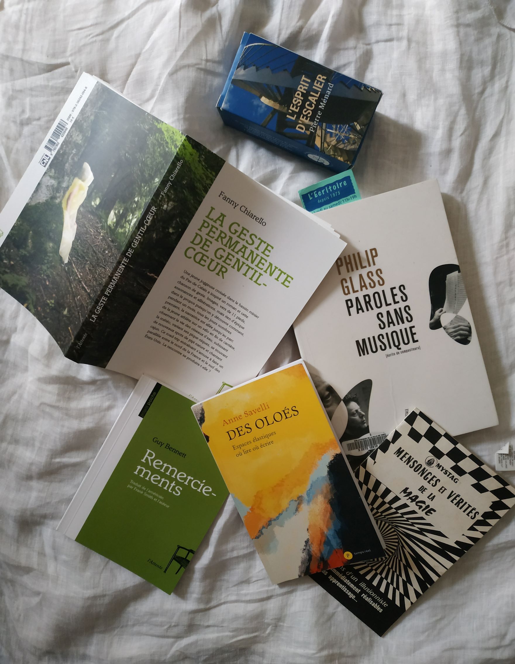 J’allais commencer ce semainier par cette constatation : je suis moins organisée depuis mon retour à Paris, pourquoi ? L’impression générale, c’est à la fois de travailler et de ne rien produire ; de ne pas comprendre à la fin de la journée quel en a été le fil. Pour mieux saisir ce qui se passe, je prends la photo de ce que je lis en ce moment. Soit : un livre lié à Bruits, un autre à mon nouveau projet sur la magie (dont je n’ai rien dit ici, encore, inutile de chercher), un qui apparaît sous forme de cartes — que je me tire chaque matin, ce qui est une façon d’imaginer l’avenir avant de l’oublier, très Esprit d’escalier tout ça, n’est-ce pas, Pierre Ménard ? — ainsi que deux livres publiés par les éditions de L’Attente dont je suis adhérente (Remerciements ne sort que le 9 juillet mais alors, précipitez-vous : c’est un texte merveilleux, un vrai compagnon). J’y ai ajouté le mien, Des oloés, en constatant ce matin qu’au lieu de me plaindre de ne pas être assez productive, je ferais mieux de penser : avec la fin du masque en extérieur et, pour l’instant, le retour à des températures plus supportables en ville, voilà qu’ils reviennent, ces lieux où lire où écrire !