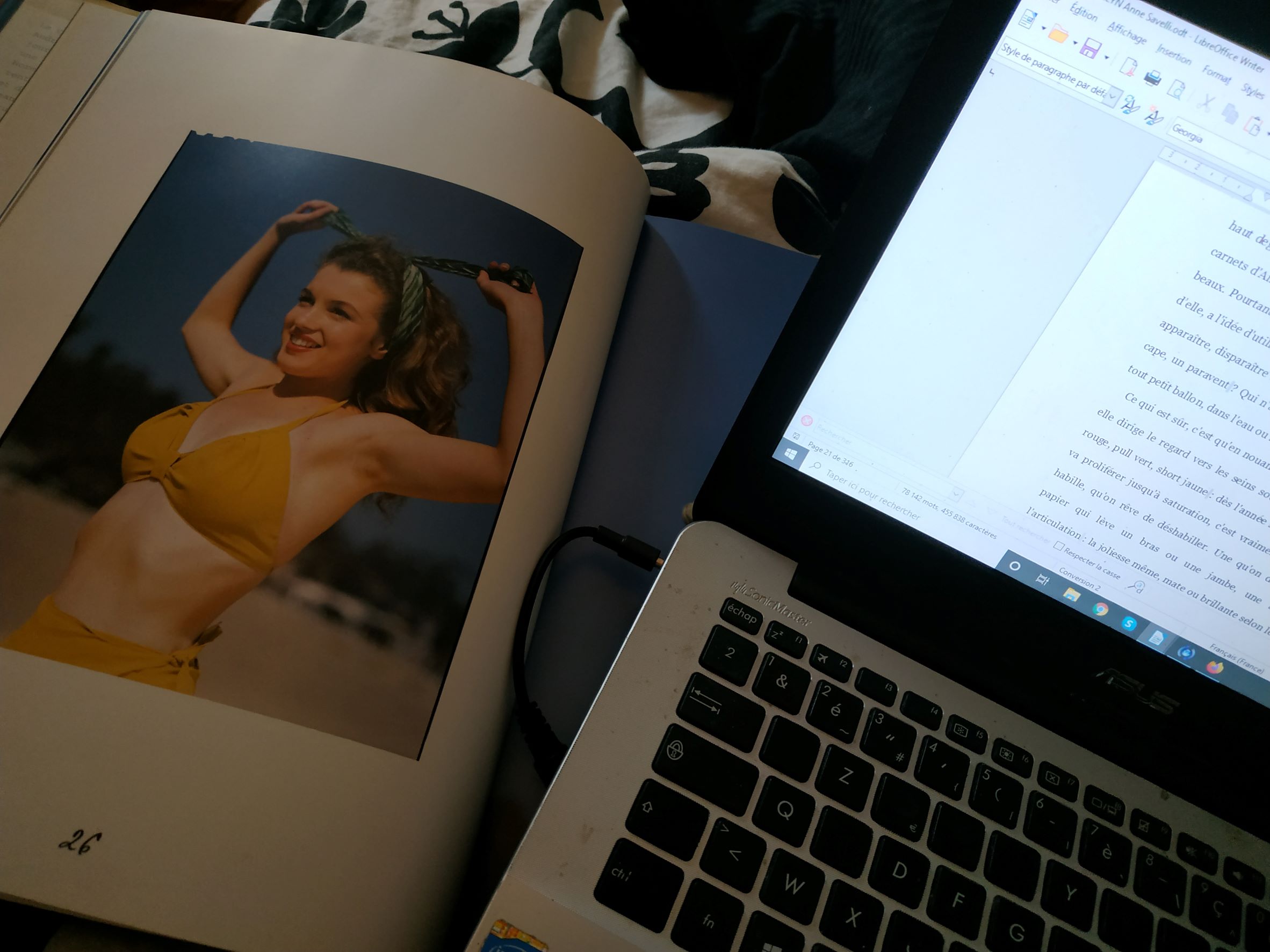 Ce dimanche, comme depuis plusieurs jours, me voici à relire Musée Marilyn (enfin !). Claro m’a annoncé très peu de re-travail (il est vrai que rééquilibrer quatre phrases sur plus de 450.000 signes, ça devrait être vite expédié) mais je ne peux m’empêcher de fignoler, de trouver de petites choses bancales à remettre d’aplomb. Quand je ne comprends plus ce que j’ai voulu dire en 2015, année où j’ai entamé ce projet qui m’en a pris trois, pas question de passer outre, même s’il ne s’agit que d’une seule phrase (c’est le cas, jusqu’ici). Ainsi, de changement de virgule en vérification sur le mouvement d’un bras (voir photo ci-dessus) je n’ai encore relu qu’un dixième du manuscrit, depuis jeudi... Ce matin, Marilyn est encore Norma Jeane. Le passage à la blondeur ne devrait plus tarder, cependant.