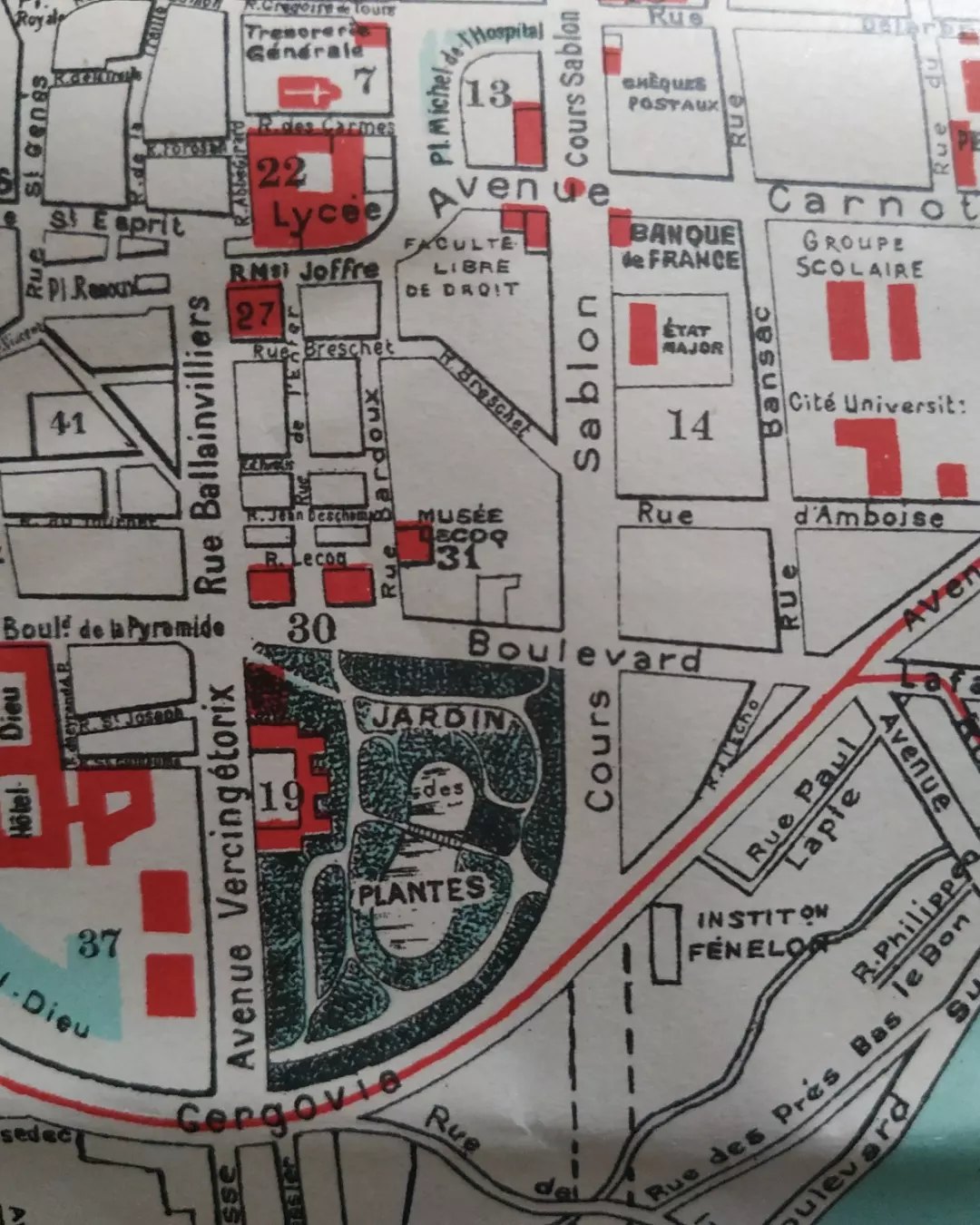 Posté il y a quelques jours des photos du guide de Clermont dont je voudrais me servir pour les ateliers. Une partie de la carte montre le jardin des plantes. Ce serait bien d’aller se planquer là, dans le plan. Après tout, le héros du Capital, c’est ta vie, finit caché à l’intérieur d’un arbre (pardon pour le spoiler).